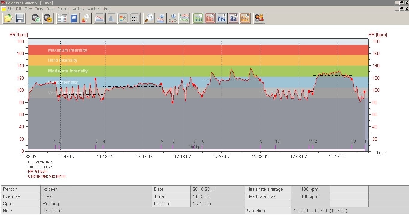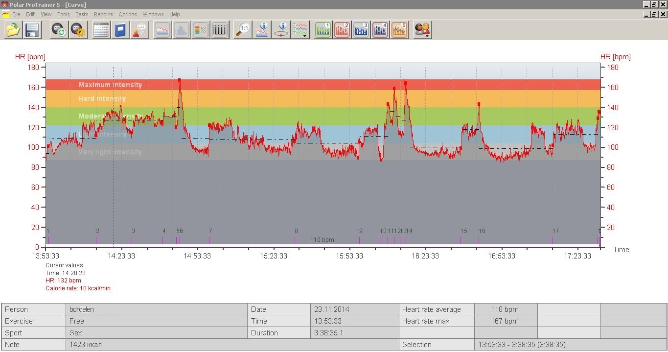 Ведь не зря же был на моей тушке в это прекрасное время мой спортивный сердечный монитор. Я его в качалке обычно использую. Графики аэробной и силовой нагрузки мне выдаёт. А чем любимое занятие всех людей не нагрузка на сердце?