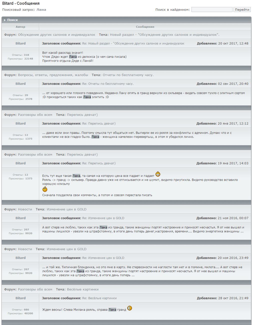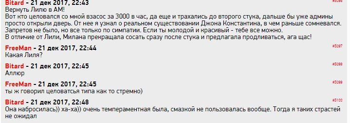 Про Лану ты тоже нашел все что я писал - да считал и считаю ее грубой и нетактичной. Какое бы настроение не было, разговаривать так с мужчиной нельзя, хотя возможно моя ошибка в том что не позвал администратора сразу и не потребовал замены. Просто я не привык к такому поведению, поэтому проглотил эти грубости.