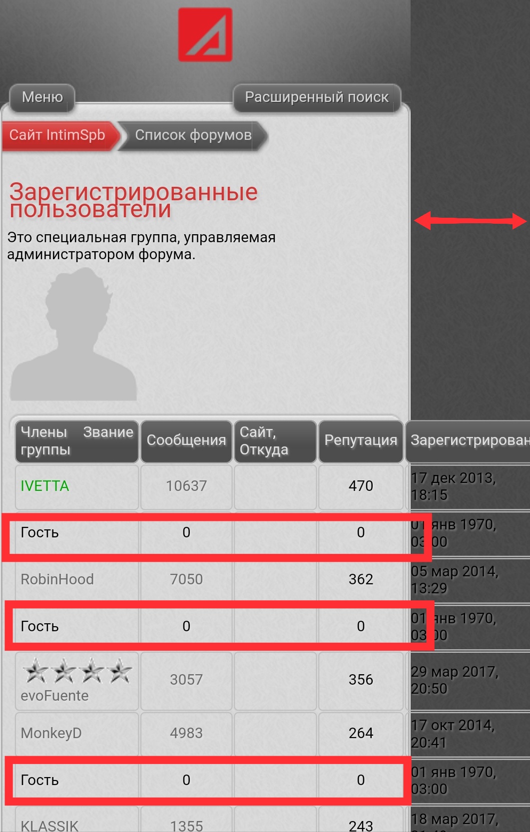 В скринах показаны поля, за которые вылещает таблица. И еще один скрин, где почти через строчку маячит "Гость"(это если смотреть пользователей не через меню, а из профиля пользователя)