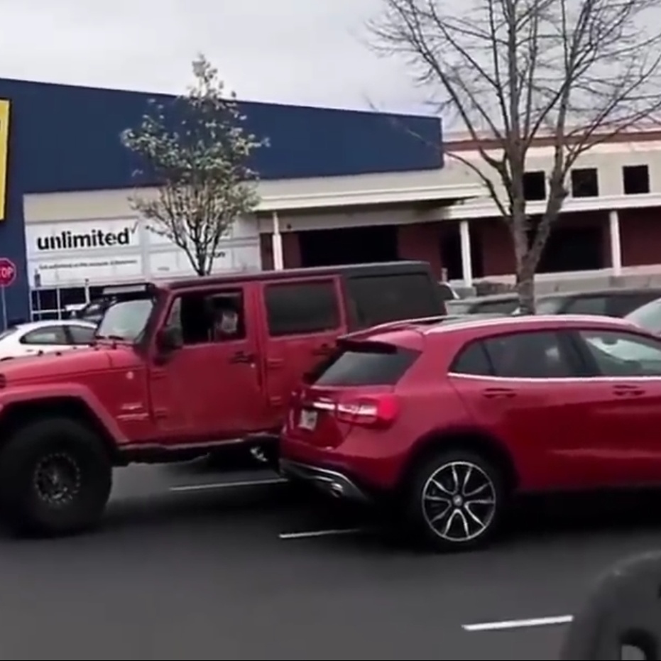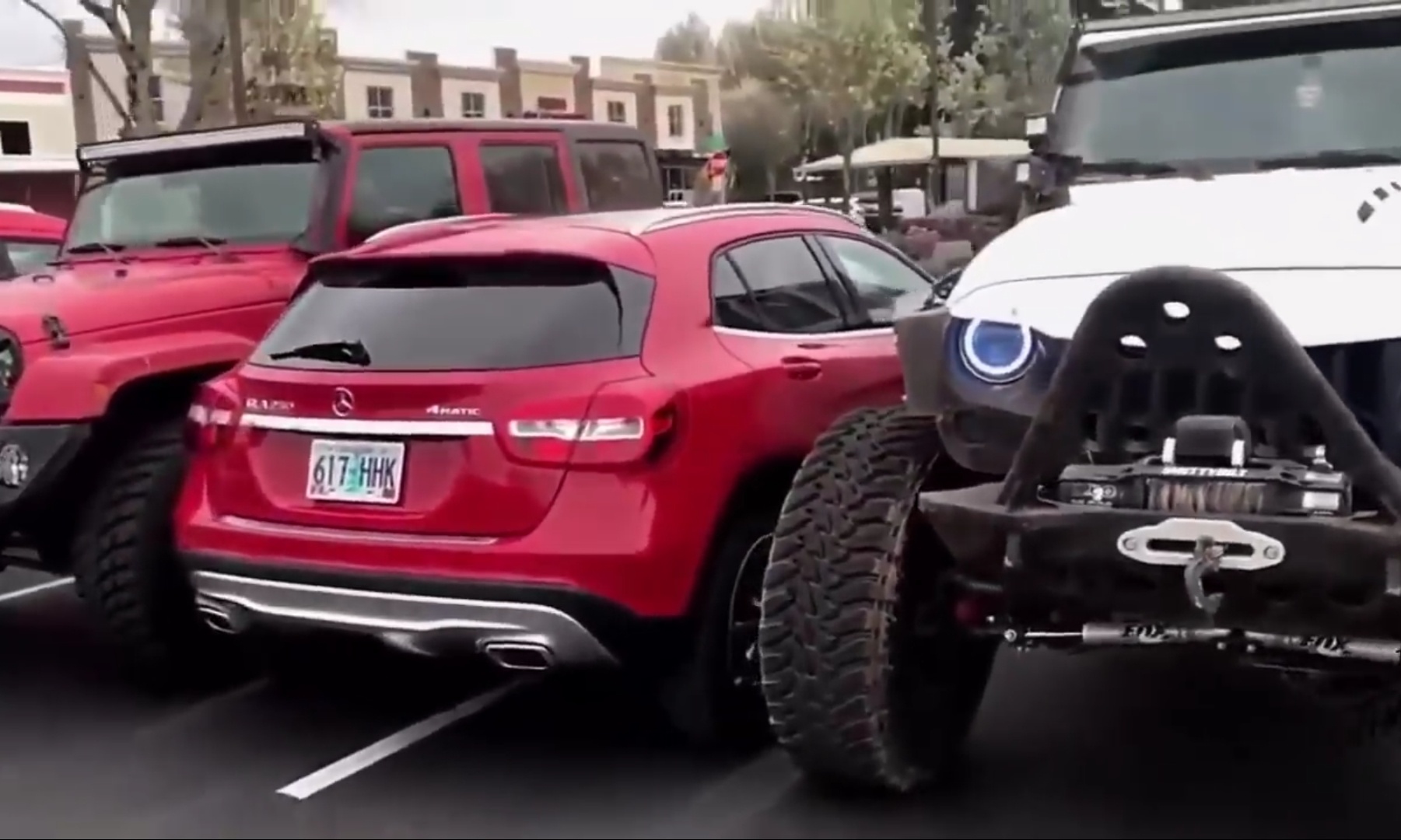 Парень на маленькой машине встал между двух парковочных мест, то есть криво. Парковка там большая, и он мог бы встать ровно, согласно разметке. Парни на джипах решили его наказать, и припарковались на оставшемся свободном пространстве от двух парковочных мест, при этом никому не мешая вокруг.