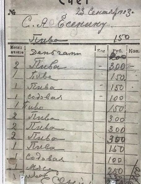 Счёт Есенина в ресторане, 1923 год