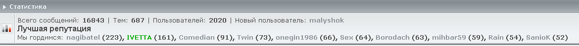 nagibatel писал(а):Sexу 30 лайков, Twin- 13, onegin1986- 8, Borodach-22, больше 150 лайков ебанул за день физик, хотел михбара выдавить с топ 10.