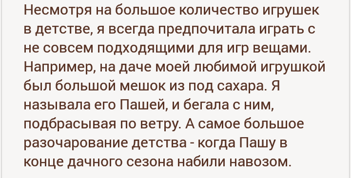 А вообще конечно в голове должно всякое лютое происходить что бы при наличии множества кукол играть с мешком из под сахара.