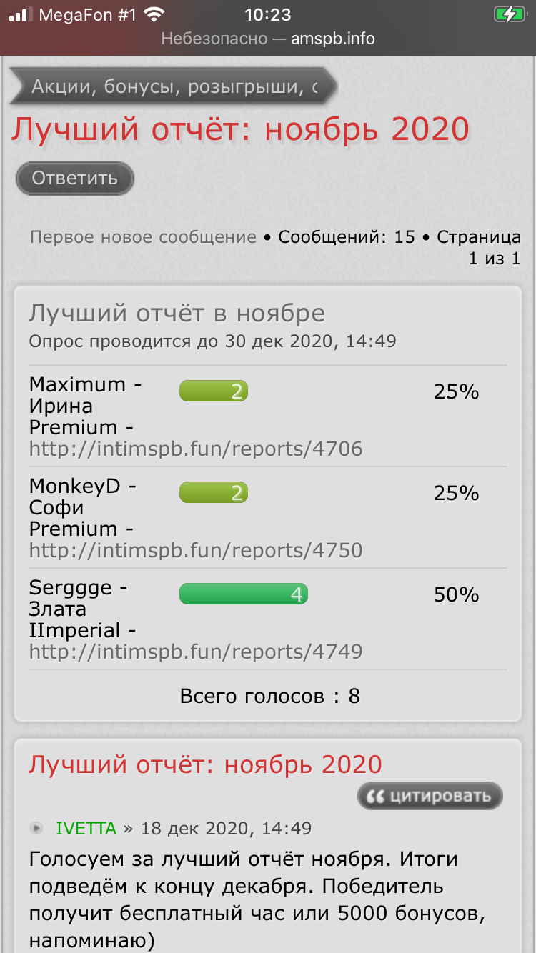 IVETTA » 7 минут назад писал(а):Голосуем за лучший отчёт ноября. Итоги подведём к концу декабря. Победитель получит бесплатный час или 5000 бонусов, напоминаю)