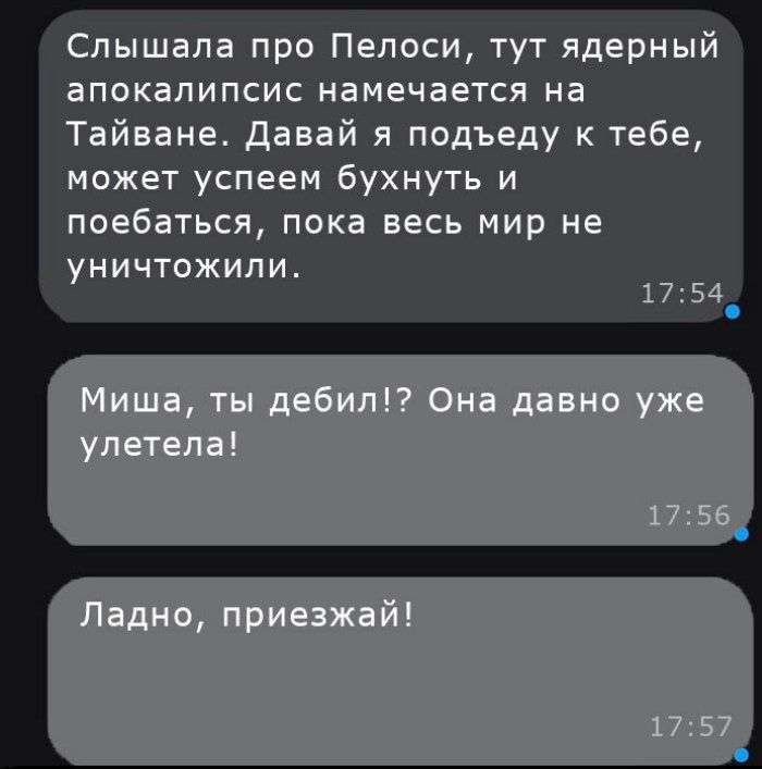 ЗЫ Да и так было понятно, что сейчас ничего не будет. Можно сказать Китай сейчас проиграл в "трусишку" или гляделки. Ну даже если бы, то Тайвань постараются вернуть без лишнего погрома, очень невзвешеным решением будет откатывать человечество на 30 лет назад из-за исчезновения их промышленности.