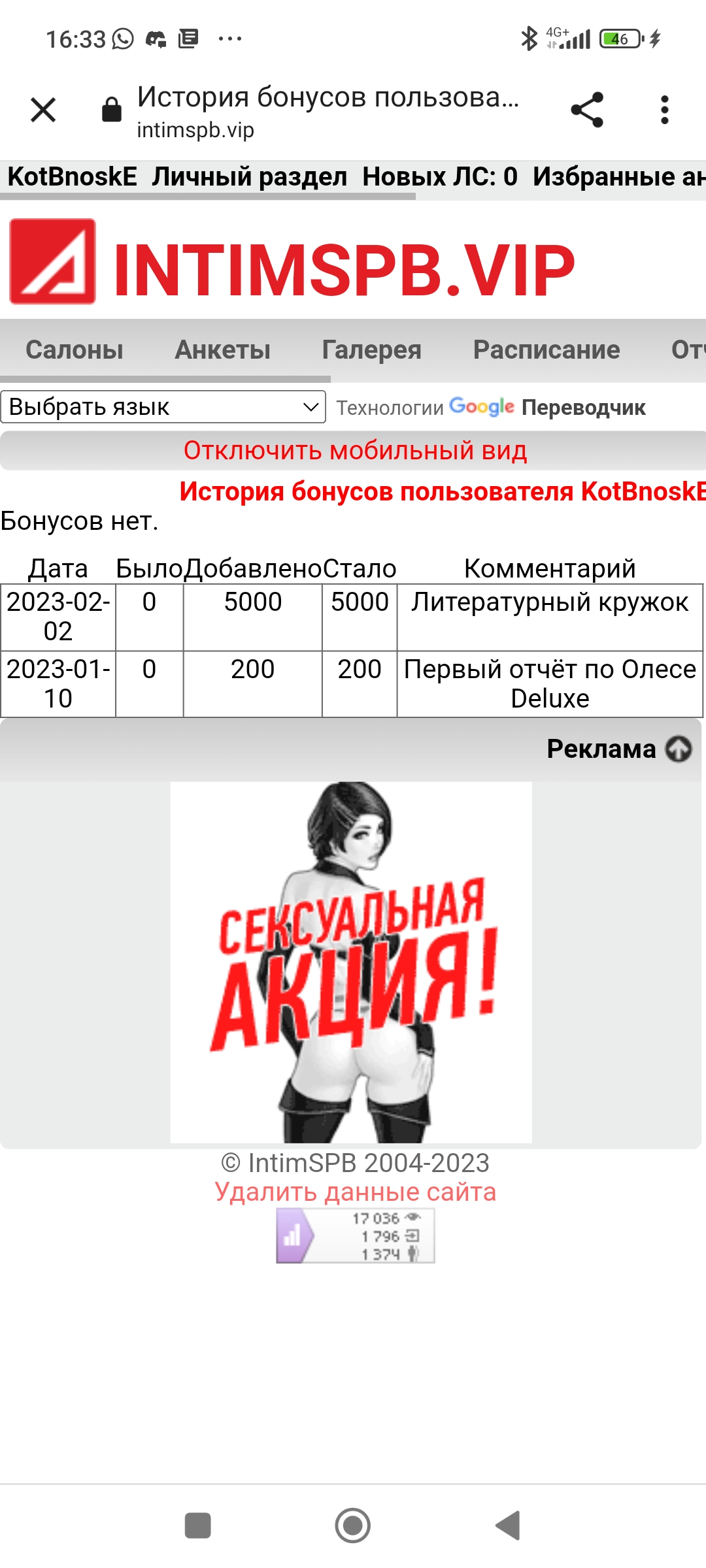 KotBnoskE » 13 минут назад писал(а):Я вот все с этими бонусами не пойму....во вкладке бонусы есть графы за их получение ....но сверху написано бонусов нет ....и кнопок каких то тоже нет чтобы их как то конвертировать ....в телеге и по смс показывает только бонусы за походы ....телефон привязан к сайту ....