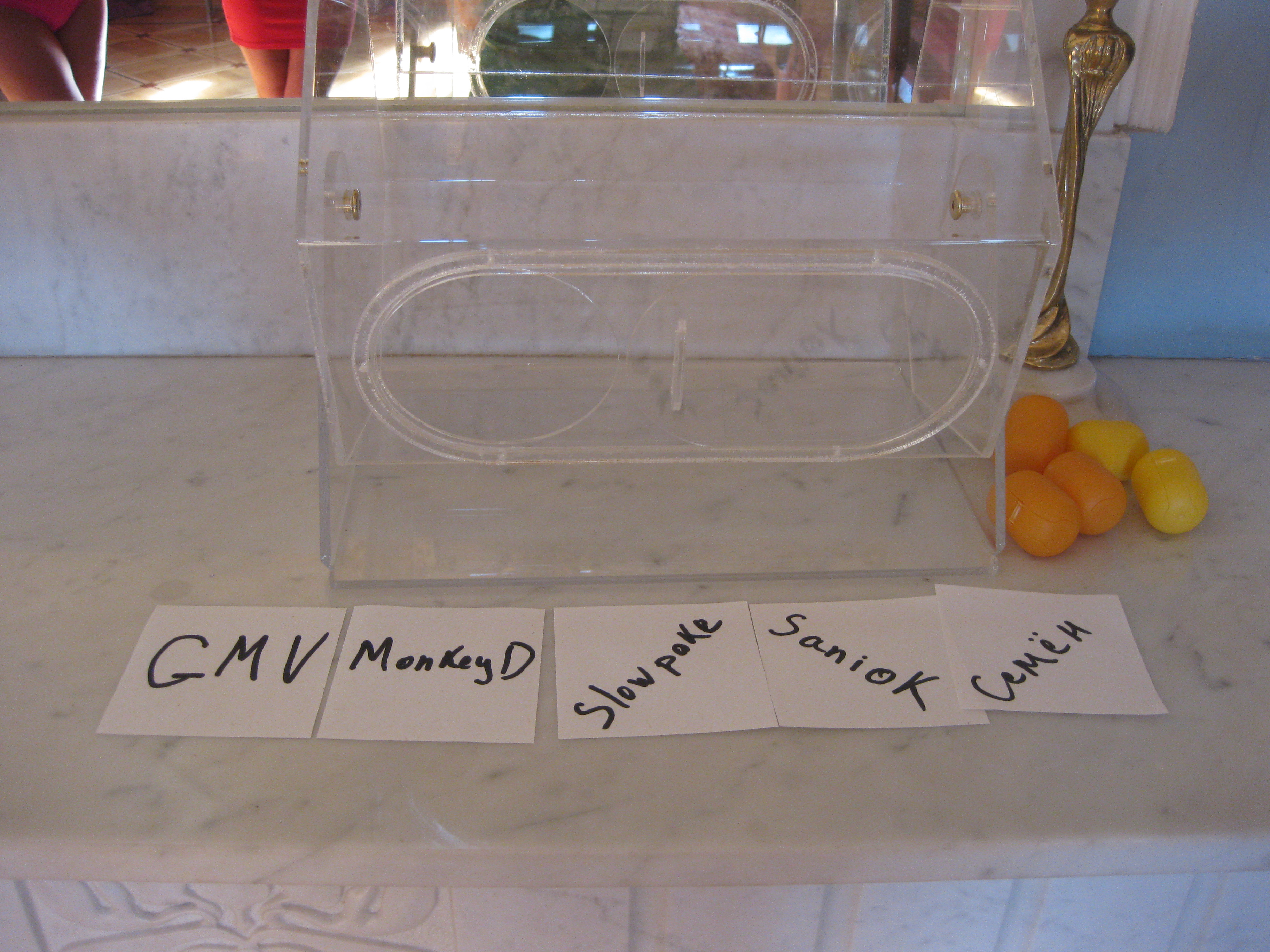 СА, смотрит на меня: - У меня сегодня день рождения, времени мало минут 10-15, будешь мне помогать. И похоже ты сегодня один. Вообшем сейчас прячем имена в киндеры и ты будешь тянуть.